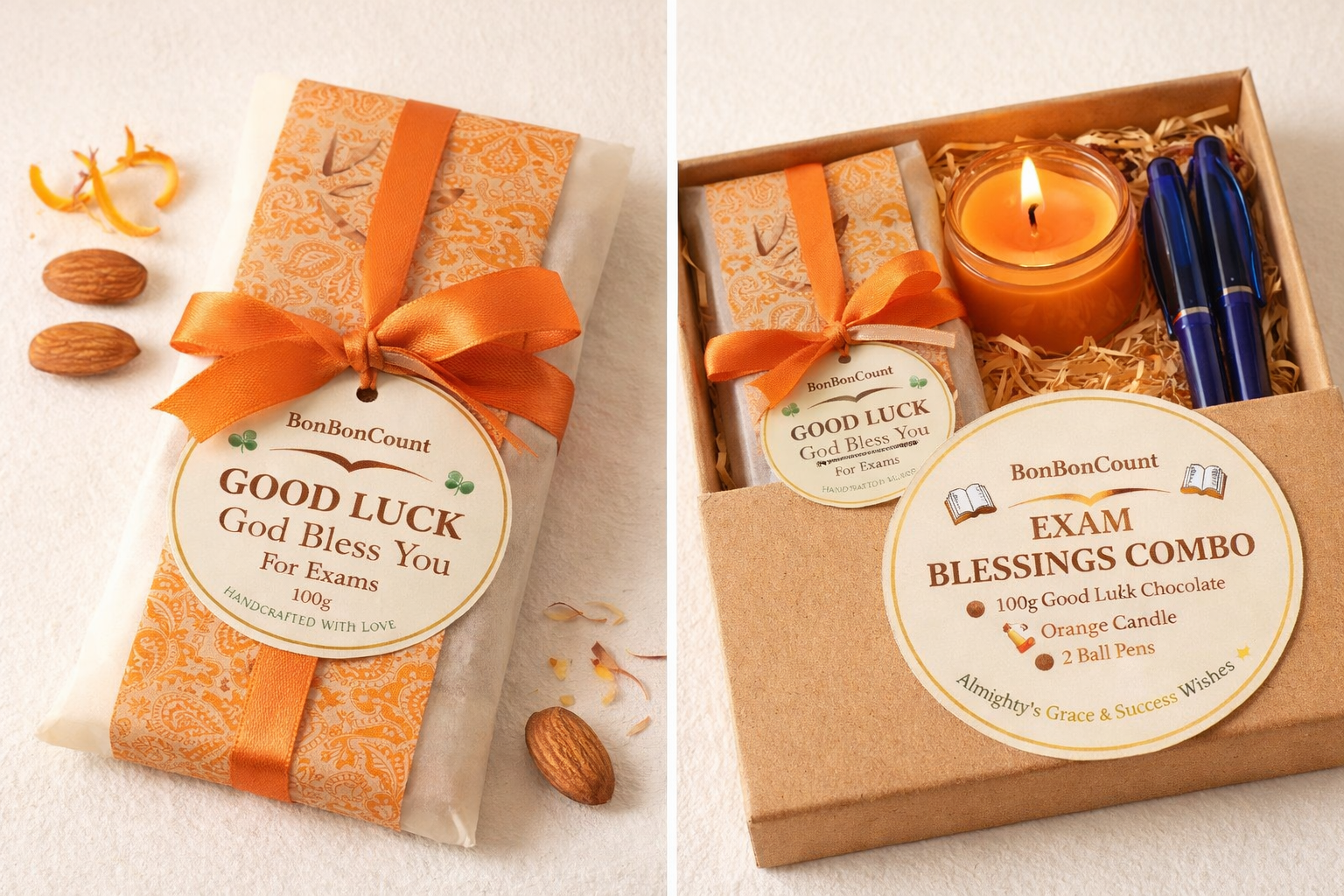 Product info: A thoughtfully handcrafted chocolate bar infused with premium saffron (kesar) and crunchy almond slivers. Designed as a sweet blessing for exams and special occasions, this chocolate combines rich taste with heartfelt wishes, making it perfect for gifting.