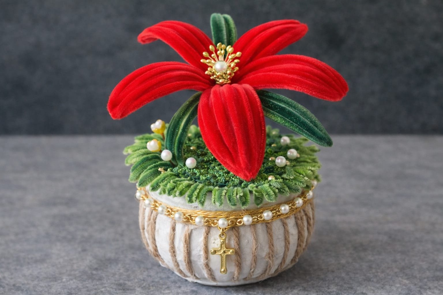 Colour: Red flower with green leaves in a decorative pot with gold and pearl accents