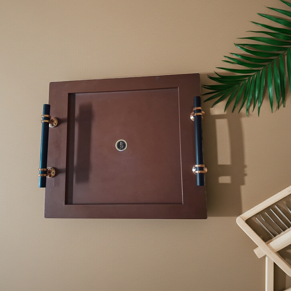 Stylish serving tray featuring sturdy dual black metal handles with gold accents. Elegant, durable, and easy to carry.